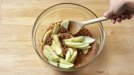Step2In large bowl, stir together remaining melted butter, 1/2 cup packed brown sugar, 1 tablespoon ground cinnamon and juice from 1 large orange until combined. Add 1 large green apple, peeled, cut into 1/4-inch-thick slices; toss to combine.