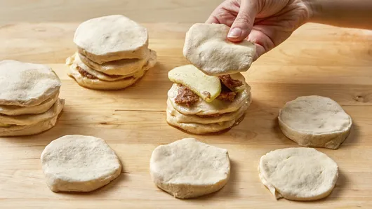 Step3Separate dough from 1 can (16.3 oz) Pillsbury™ Grands!™ Flaky Layers refrigerated original or buttermilk biscuits into 8 biscuits. Split biscuits in half to make 16 biscuit rounds; place on work surface or cutting board.
