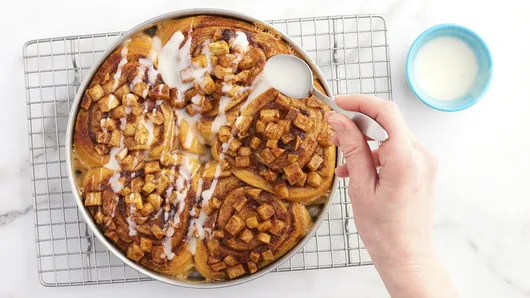 In small microwavable bowl, microwave reserved icing uncovered on High 5 to 10 seconds, stirring until thin enough to drizzle. Drizzle icing over tops of baked rolls. Cool 5 minutes before serving.