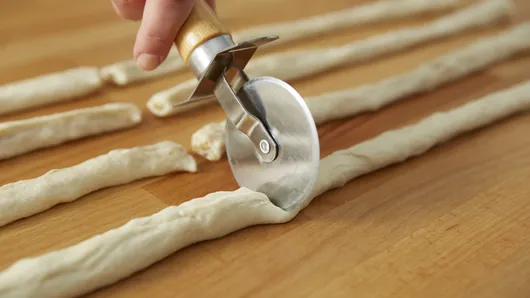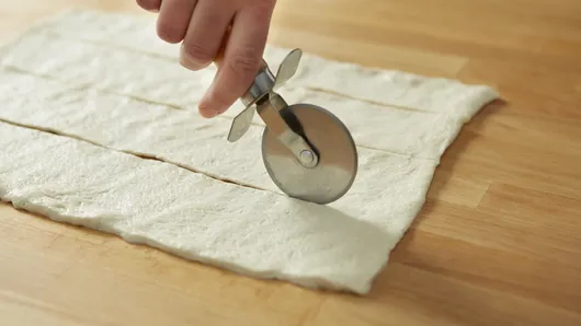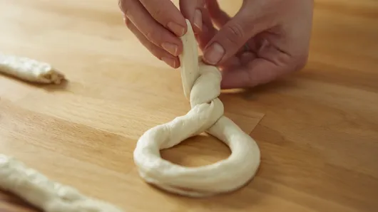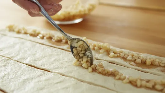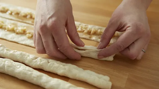 Step2Spoon filling onto long edge of each dough strip. Stretch dough over filling, press to seal. Cut each strip in half, making 8 filled pieces. Stretch each piece to 12 inches. Form dough into pretzel shape.