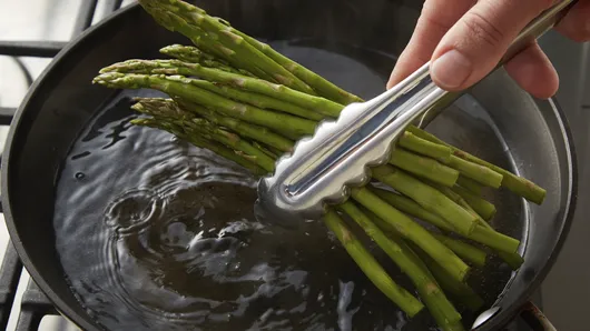 Step2Remove woody ends from asparagus spears; discard. In 10-inch skillet, heat 1/2 inch water to boiling. Add asparagus; reduce heat to medium-low. Cover; simmer 2 to 3 minutes or until crisp-tender. Drain. Plunge asparagus into bowl of ice water to cool; drain on paper towels.