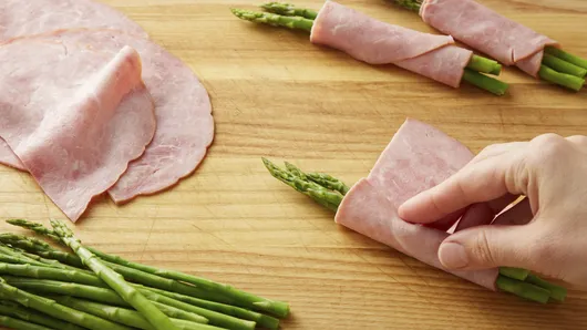 Step3Cut ham slices in half; wrap one half slice around middle of 3 asparagus spears. Repeat for remaining ham and asparagus spears.