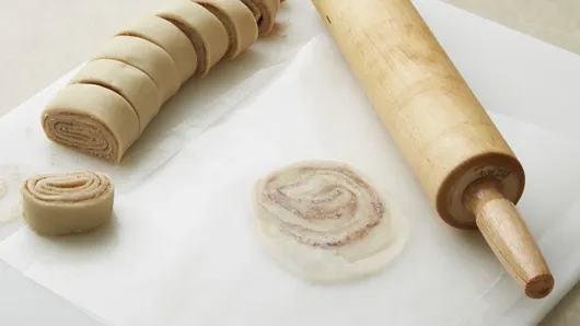 Step5Cut the roll into 12 (1-inch) slices, then press down slightly, and roll individually between the sheets of waxed paper to 1/4-inch slices, replacing waxed paper as needed. Place on ungreased cookie sheets.