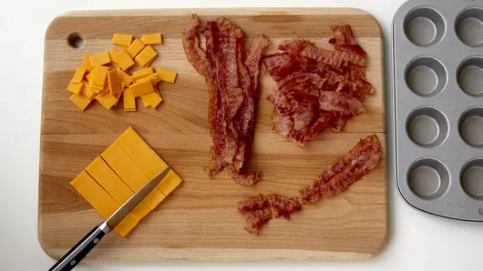 Step1Heat oven to 350°F. Spray 32 nonstick mini muffin cups with cooking spray. Cut each bacon slice into 6 pieces; set aside. Cut each cheese slice crosswise into 4 strips, then cut each strip crosswise into 6 pieces for a total of 24 pieces per slice.