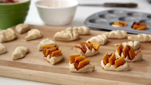 Step3Stuff each slit with a piece of bacon and cheese, folding the bacon in half. Place assembled biscuit bites into each muffin cup, filling side up. Bake 15 to 17 minutes or until cheese is melted and biscuit dough is golden brown.