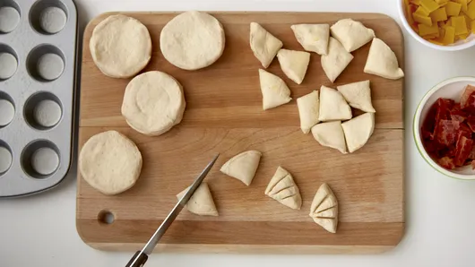 Step2Separate dough into 8 biscuits, and cut each into quarters. With serrated knife, carefully cut 3 slits into top of each biscuit piece about 1/4 inch apart, without cutting all the way through to the bottom.