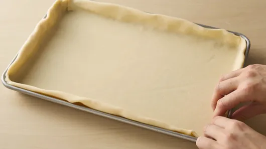 Step2Fit crust into pan, pressing firmly into corners and sides. Fold extra crust up and over edges of pan. Seal any tears in crust. Bake 6 minutes; remove from oven, and cool 10 minutes. Reduce oven temperature to 375°F.