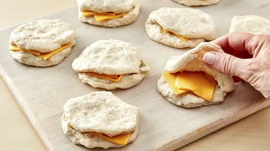 Step3Separate dough into 8 biscuits; let stand 5 minutes. Gently pull each biscuit apart, leaving bottom and lower sides intact, forming deep pocket. Place 2 quartered pieces of American cheese inside biscuit pocket.