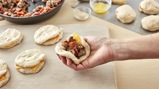 Get the best flavors of your favorite cheeseburger—bacon, steak-seasoned ground beef and American cheese—all stuffed in a flaky, buttery biscuit for the tastiest grab-and-go meal you’ll make this week. Serve it with your favorite burger fixings like pickles, ketchup and mustard for an extra flavor punch!