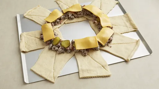 Step3Spoon beef mixture on the half of each rectangle closest to center of ring; top each with 2 pickle slices and 1 piece of cheese.