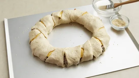Step5Gently separate dough perforations on top until filling peeks through. Brush dough lightly with water; sprinkle with sesame seed. Bake 20 to 25 minutes or until dough is golden brown and thoroughly baked. Cool 5 to 10 minutes before cutting into serving slices.