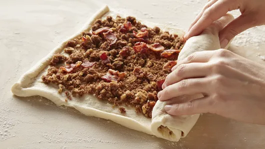 Step3Lightly sprinkle large cutting board with flour. Unroll pizza dough on board. Reserve 2 teaspoons of the melted butter. Brush remaining butter evenly on dough to within 1/2 inch of short sides. Sprinkle brown sugar mixture and bacon evenly over butter. Starting with short side, roll up; pinch edge to seal. Place seam side down on cutting board.