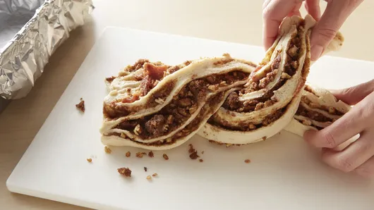 Step4With serrated knife, cut roll in half lengthwise, forming 2 strips. Place cut side up. Carefully overlap strips 2 to 3 times to form twist. Press ends to seal. Place in pan. Bake 45 to 50 minutes or until deep golden brown and no longer doughy in center. Cover with foil last 5 to 10 minutes of bake time to prevent overbrowning. Remove to cooling rack. Cool 15 minutes. Carefully lift out of pan using sides of foil. Place on cutting board; remove foil.