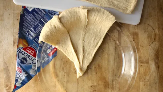 Step1Heat oven to 350° F. Unroll 1 can Pillsbury™ refrigerated crescent dinner rolls; separate into 8 triangles. Arrange triangles in ungreased 9-inch glass pie plate, pressing seams together and trimming any excess dough. Bake 10 minutes. Remove from oven; cool slightly.