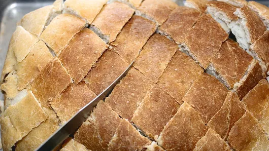 Step4Remove loaf from pan; place on ungreased cookie sheet. Cut diagonal slices in loaf, cutting to but not through bottom of loaf. Repeat cutting diagonal slices the opposite way, creating diamond cuts in loaf.
