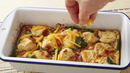 var configuration = {"title":"Bacon, Egg and Cheese Biscuit Casserole for Two","introduction":"Want to make a special breakfast casserole without inviting a bunch of people over? Now you can! This perfectly proportioned mini version of one of our most popular egg bakes is made in a loaf pan, so it serves just a few people. Bacon, fresh spinach, onions and Cheddar mixed with frozen Pillsbury™ Biscuits give this dish a lot of flavor with little effort.","servingSize":"1 Serving","image":{"small":{"media":"(min-width: 0px)","src":"https://mojo.generalmills.com/api/public/content/bltFKXM530Gyor09EB8Ydw_webp_base.webp?v=26e9d876\u0026t=e724eca7b3c24a8aaa6e089ed9e611fd"},"medium":{"media":"(min-width: 500px)","src":"https://mojo.generalmills.com/api/public/content/bltFKXM530Gyor09EB8Ydw_webp_base.webp?v=26e9d876\u0026t=191ddcab8d1c415fa10fa00a14351227"},"large":{"media":"(min-width: 767px)","src":"https://mojo.generalmills.com/api/public/content/bltFKXM530Gyor09EB8Ydw_webp_base.webp?v=26e9d876\u0026t=191ddcab8d1c415fa10fa00a14351227"},"alt":"Bacon, Egg and Cheese Biscuit Casserole for Two"},"contributor":{"label":"By","name":"Pillsbury Kitchens","profileUrl":"/about-us","displayDate":{"label":"Updated","date":"May 7, 2021"}},"ingredientGroups":[{"ingredients":[{"quantity":"1","description":"tablespoon butter "},{"quantity":"1/4","description":"cup chopped onion "},{"quantity":"1","description":"cup packed baby spinach (from 5-oz package) "},{"quantity":"2","description":"biscuits from 1 bag (25 oz) frozen Pillsbury™ Grands!™ Buttermilk Biscuits (12 Count)","productLink":"/products/biscuits/grands-frozen-biscuits/buttermilk"},{"quantity":"3","description":"eggs "},{"quantity":"1/2","description":"cup milk "},{"quantity":"1/8","description":"teaspoon pepper "},{"quantity":"1/2","description":"cup chopped cooked bacon"},{"quantity":"1/2","description":"cup shredded sharp Cheddar cheese (2 oz)"},{"quantity":"","description":"Chopped Italian (flat-leaf) parsley, if desired "}]}],"steps":[{"description":"Heat oven to 350°F. Spray 8x4-inch loaf pan with cooking spray."},{"description":"In 8- or 10-inch nonstick skillet, melt butter over medium-high heat. Add onion; cook 2 to 3 minutes, stirring frequently, until tender; stir in spinach, and cook until starting to wilt. Remove from heat."},{"description":"On microwavable plate, microwave biscuits uncovered on Medium-Low (30%) 1 to 1 1/2 minutes or until thawed. Cut each biscuit into 8 pieces; place in pan.","stepShotImageUrl":"//mojo.generalmills.com/api/public/content/QKdAJygGzUyEQsmQMgPUUQ_webp_base.webp?v=0ccf03cb\u0026t=51a43a57af4046789e5a7f20567b1195"},{"description":"In medium bowl, beat eggs, milk and pepper with whisk until blended. Stir in bacon, spinach mixture and 1/4 cup of the cheese. Pour mixture over biscuits in pan, stirring slightly to evenly distribute.","stepShotImageUrl":"//mojo.generalmills.com/api/public/content/5YsYFTcQUkS3Rrd959NLZA_webp_base.webp?v=9e24d4af\u0026t=51a43a57af4046789e5a7f20567b1195"},{"description":"Bake 35 to 40 minutes or until edges are golden brown and center is set. Top with remaining 1/4 cup cheese; bake 2 to 3 minutes or until cheese is melted. Let stand 5 minutes. Garnish with parsley before serving.","stepShotImageUrl":"//mojo.generalmills.com/api/public/content/6w_Av6JiDkCHlLhXVn5xZQ_webp_base.webp?v=85c94eb1\u0026t=51a43a57af4046789e5a7f20567b1195"}],"tips":[{"title":"","description":"Frozen biscuits may be thawed on a plate at room temperature 30 to 45 minutes.","category":"No Title","tipShots":[]},{"title":"","description":"Precooked bacon is sold in the refrigerated packaged meat section of the grocery store.","category":"No Title","tipShots":[]},{"title":"","description":"This recipe makes two large servings or four smaller servings.","category":"No Title","tipShots":[]},{"title":"","description":"Kitchen Tested - 5/2018.","category":"Kitchen Tested","tipShots":[]}],"kitchenTips":[{"title":"","description":"Frozen biscuits may be thawed on a plate at room temperature 30 to 45 minutes.","category":"No Title","tipShots":[]},{"title":"","description":"Precooked bacon is sold in the refrigerated packaged meat section of the grocery store.","category":"No Title","tipShots":[]},{"title":"","description":"This recipe makes two large servings or four smaller servings.","category":"No Title","tipShots":[]}],"additionalContent":[],"faq":[],"tipCategories":[{"categoryName":"Kitchen Tested","heading":"More About This Recipe","cssClass":"recipePartStory","expandOnInit":false,"expandText":"More +","collapseText":"Less -","expandEventName":"","collapseEventName":"","image":"","tips":[{"title":"","description":"Kitchen Tested - 5/2018.","category":"Kitchen Tested","tipShots":[]}],"isExpandable":false}],"nutritionInfo":{"configuration":{"showAsTable":false,"noNutritionInformationAvailableMessage":"No nutrition information available for this recipe","poweredByText":"\u003cp\u003eNutrition information for this recipe is estimated using a leading nutrition calculation application, but is an estimate only. Actual nutrition values will vary based on the exact ingredients or brands you may use.\u003c/p\u003e\n\u003ca href=\u0022http://developer.edamam.com\u0022\u003ePowered By \u003cimg src=\u0022-/media/C4F33FD467AB4A3AB59AAC4F6306AB04.ashx\u0022 alt=\u0022Edamam\u0022 /\u003e\u003c/a\u003e","nutritionChartTitle":"Nutrition Facts","nutritionInformationLabel":"Nutrition","servingSizeText":"Serving Size:","dailyValuesDisclaimer":"*Percent Daily Values are based on a 2,000 calorie diet.","percentDailyValueText":"% Daily Value","percentDailyValueFooterTitleText":"% Daily Value*:","exchangeInformationTitleText":"Exchanges:","nutritionFactsExpandText":"More Nutrition","nutritionFactsCollapseText":"Less Nutrition"},"facts":{"carbohydrateChoice":{"amountPercent":"","amountUnits":"2","title":"Carbohydrate Choice"},"vitaminA":{"amountPercent":"50%","amountUnits":"50%","title":"Vitamin A"},"vitaminC":{"amountPercent":"4%"