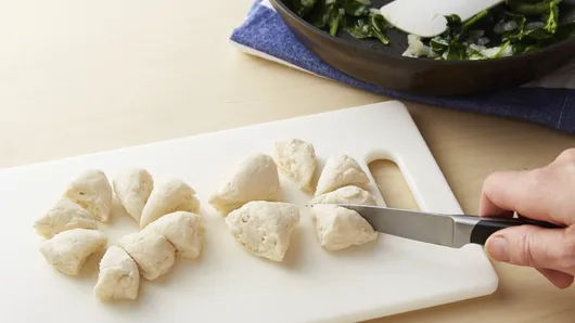 On microwavable plate, microwave biscuits uncovered on Medium-Low (30%) 1 to 1 1/2 minutes or until thawed. Cut each biscuit into 8 pieces; place in pan.