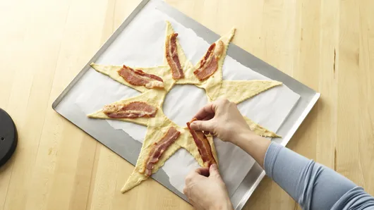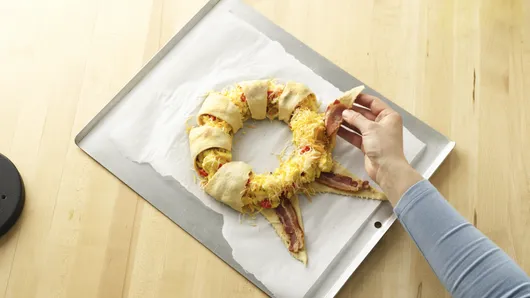 Step4Place bacon on each of the triangles. Sprinkle 1/3 cup of the cheese onto widest part of dough. Spoon eggs over cheese. Sprinkle with 1/3 cup of the cheese. Pull points of triangles over eggs and cheese, and tuck under dough to form ring (filling will be visible). Carefully brush dough with remaining 1 tablespoon milk; sprinkle with remaining 1/3 cup cheese.