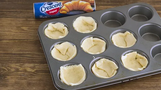 Step2Unroll 1 can (8 oz) Pillsbury™ refrigerated crescent dinner rolls; separate dough into 8 triangles. Place 1 triangle in muffin cup; press in cup to cover bottom and around side. Use scissors to cut off excess dough; use to fill in any spaces to create a seamless muffin cup. Repeat with remaining triangles.