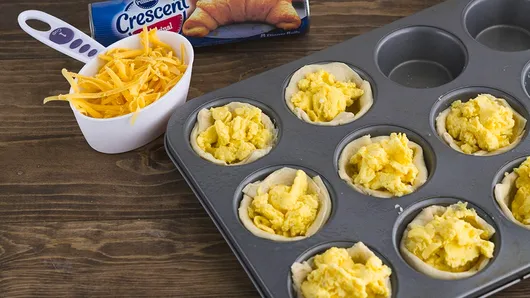 Step4Divide eggs evenly among dough-lined muffin cups. Top each with 1 tablespoon shredded Cheddar cheese.