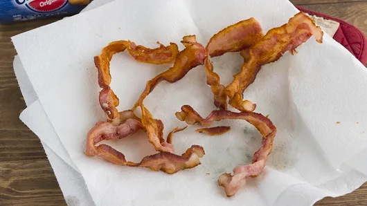 Step6Meanwhile, in another large skillet, cook 8 slices bacon over medium heat just until done but not crisp. Drain well on paper towels. While bacon is hot, fold it over like handle of basket. (Once bacon cools, it will become fragile and will not bend. It needs to cool in the rounded shape.)
