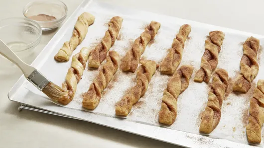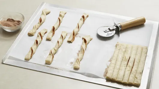 Step4With sharp knife or pizza cutter, cut each rectangle stack lengthwise into 6 strips. Twist each strip 3 times; place on ungreased cookie sheet.