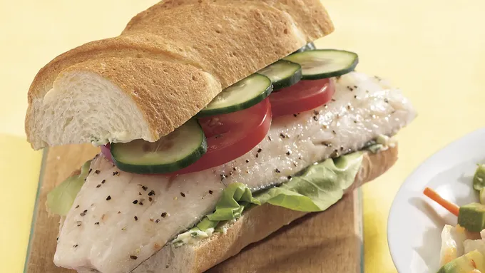 Step4With serrated knife, cut buns in half horizontally. Spread bottom half of each bun with 1 tablespoon tartar sauce. Top each with 2 fish sticks and 1/4 cup lettuce. Cover each with top half of bun.