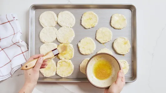 Open the can of biscuits, and gently separate each biscuit in half so there are 16 rounds. On one half of a sheet pan, arrange 2 rows of 4 biscuit rounds, placing them close together so all 8 biscuits are just barely touching. These will form the base of the sandwich. Place the other 8 biscuit rounds on the other half of the sheet pan, farther apart. These will be the tops of the sliders. Brush the butter mixture over all 16 biscuit rounds. Bake the biscuits for 8 to 12 minutes, or until biscuit tops are golden brown. Remove from the oven.