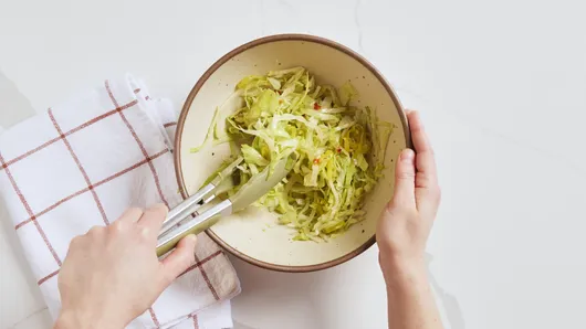 While the biscuits bake, make the salad topping. In a medium bowl, mix together the Italian dressing and mayonnaise. Add shredded lettuce and pepperoncini; gently toss until everything is evenly coated. Set the salad aside until ready to use.