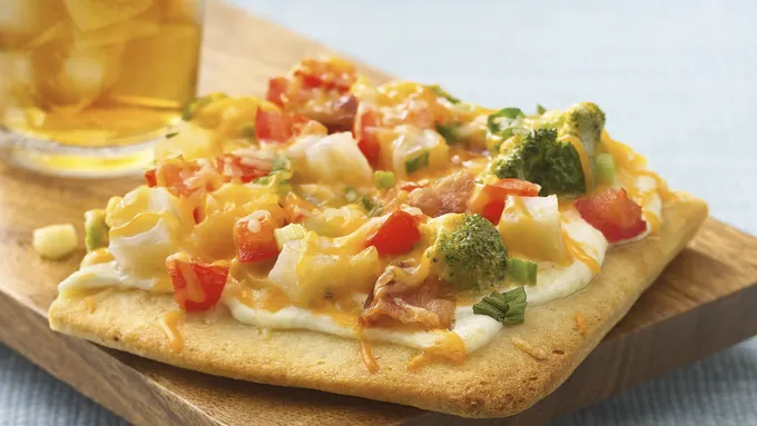 Step2Arrange provolone cheese slices on dough. In medium bowl, mix potato, olive oil and ranch dressing mix. Spoon evenly over cheese. Sprinkle with bacon and Cheddar cheese.