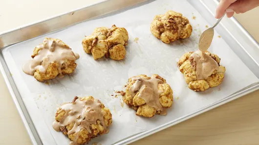 The best kinds of treats are the ones you can eat for both breakfast and dessert. These fall-flavored fritters start with cut-up biscuits tossed with pecans, pumpkin and spice, and end with a sweet pumpkin glaze.