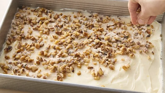 Step3In medium bowl, mix remaining 1/2 cup sugar, the walnuts and cinnamon; sprinkle evenly over cream cheese mixture.