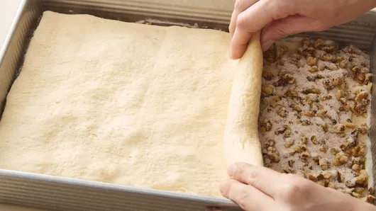 Step4Unroll second can of dough. Carefully place on top of walnut mixture, stretching dough to cover filling.