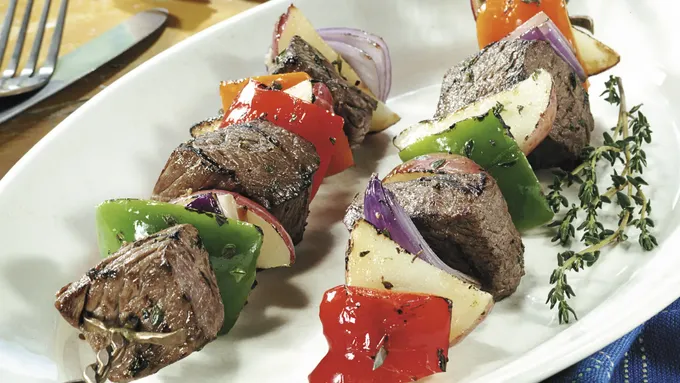 Step2Heat grill. Remove steak and vegetables from marinade; reserve marinade. Alternately thread steak and vegetables onto six 12 to 14-inch metal skewers. Brush with reserved marinade.