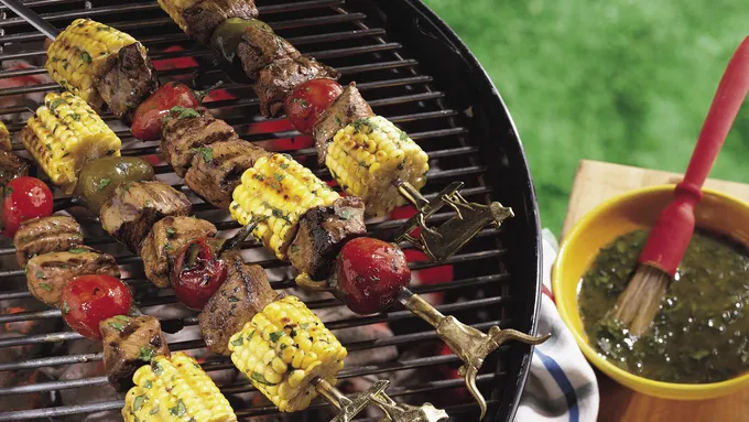 Step3When ready to grill, place kabobs on gas grill over medium heat or on charcoal grill 4 to 6 inches from medium coals; cover grill. Cook 6 to 8 minutes or until steak is of desired doneness, turning 2 or 3 times and brushing occasionally with marinade. Discard any remaining marinade.