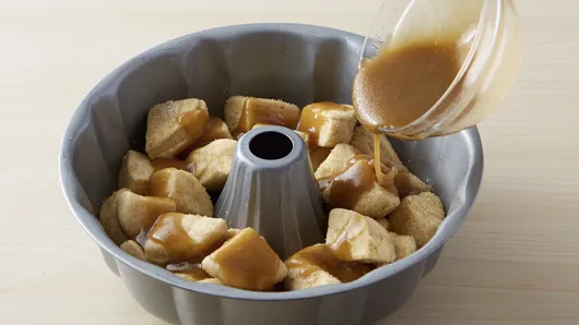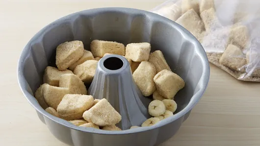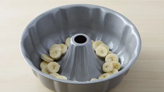 Step1Heat oven to 350°F. Spray 12-cup fluted tube cake pan with baking spray with flour. Arrange sliced bananas in single layer in bottom of pan.