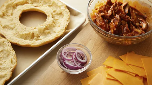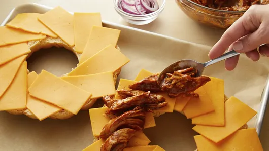 Step5Use decorative side of bread ring for top of Bundtwich. Place 12 of the cheese slice halves in decorative side of bread ring. Place remaining cheese slice halves evenly in other side of bread ring. Top evenly with chicken mixture and onion. Bake 8 to 12 minutes or until cheese is melted and rings are hot.