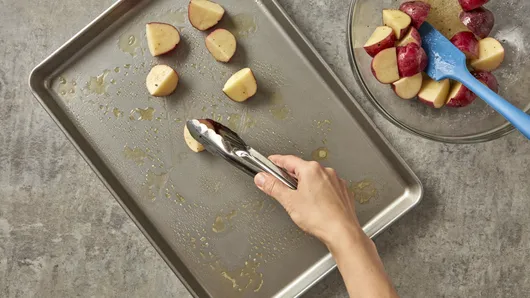 Small New Potatoes: If some of your potatoes are larger, cut in sixths or eighths instead of quarters. Similarly-sized pieces cook most evenly.