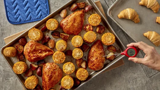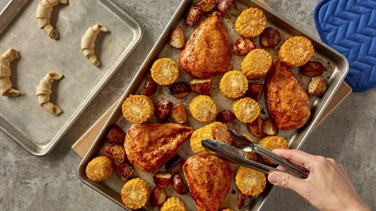 Our sheet-pan dinner includes its own sides–roasted potatoes, corn on the cob, and crescent rolls. But other classic barbecue chicken sides are coleslaw, potato salad, baked beans, mac and cheese, and cornbread.