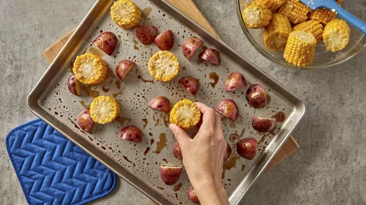 When placing the corn and chicken on the pan, move the potatoes out of the way and make sure there’s room to place all of the chicken and corn in a single layer.