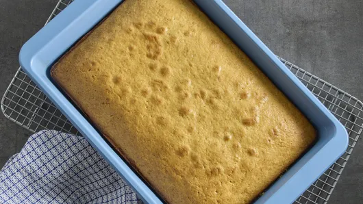 13x9-Inch Pan: We recommend a shiny, uncoated metal pan which reflects heat best for a tender crumb and light crust. If you're using a dark, nonstick pan, lower the oven temperature to 325°F to prevent overbrowning.