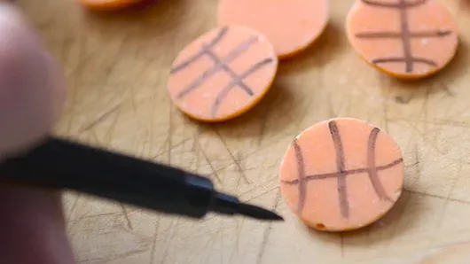 Step5Remove from oven; cool in cups 5 minutes. Press 1 orange candy melt flat side up on top of each pie. Cool candy completely; then draw basketball marks on each candy with edible color pen. Cool pies completely, about 15 minutes.