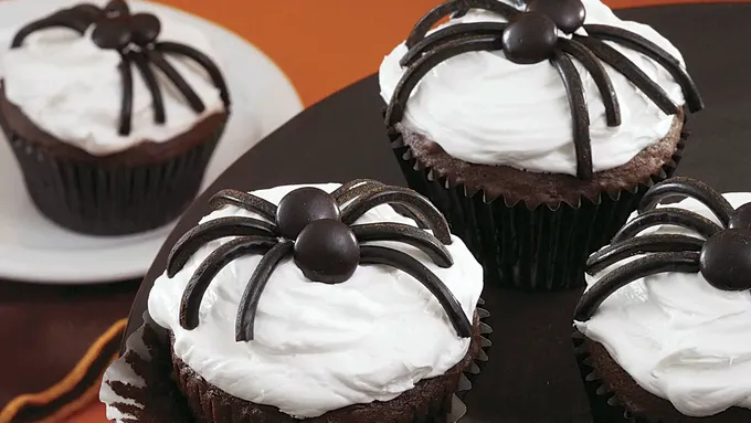 Step3Line large cookie sheet with waxed paper or cooking parchment paper. On another piece of paper, draw and cut out bat shape about 2 1/2 x 1 inch. Place shape under waxed paper. In small microwavable bowl, place chocolate chips. Microwave uncovered on High 1 minute; stir. Microwave in 15-second increments, stirring after each, until melted and smooth. Place chocolate in small resealable freezer plastic bag; seal. Cut off tiny corner of bag. Squeeze chocolate onto waxed paper to make bat, filling in bat shape underneath as guide and making 24 bats. Cut 1/4-inch pieces of licorice; place on each bat for eyes. Refrigerate about 15 minutes or freeze about 5 minutes until set. Peel waxed paper from chocolate. Place 1 chocolate bat on top of each cupcake just before serving. Store loosely covered.