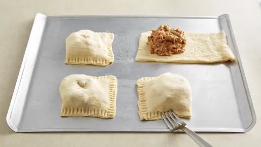 Step2Unroll dough; cut into 4 (6x4-inch) rectangles. Place dough rectangles on ungreased cookie sheet. Top short side of rectangle half with about 1/2 cup chicken mixture. Fold dough from top over filling, firmly pressing edges with fork to seal. With fork, prick top of each to allow steam to escape. Repeat for remaining dough and filling.