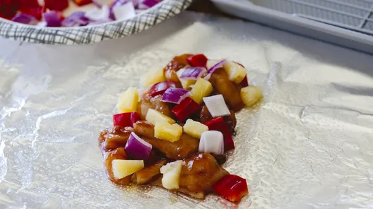 Step3Divide chicken pieces evenly among sheets of foil. Divide 2 cups drained pineapple tidbits, 1 bell pepper, diced, and 1 small red onion, diced, evenly over chicken on foil sheets.