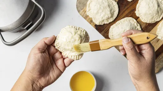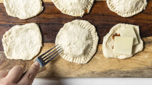 Evenly distribute the pulled pork mixture onto 8 of the rounds, about 2 tablespoons each. Top each with two squares of Monterey Jack cheese. Place the remaining biscuit dough rounds on top of the cheese, covering the filling to form 8 sandwiches. Gently press down around the edges with your fingers to enclose the filling, then use the tines of a fork to crimp the sides of each sandwich and seal it closed.