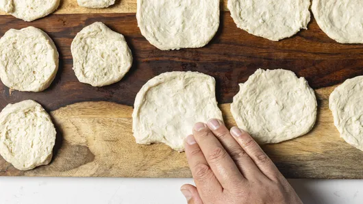 Open the can of biscuits, and gently separate each biscuit into two parts to get 16 rounds. On a cutting board or other surface, use your hands to gently press each round into an approximately 4-inch circle. Alternatively, use a rolling pin to roll out each round.
