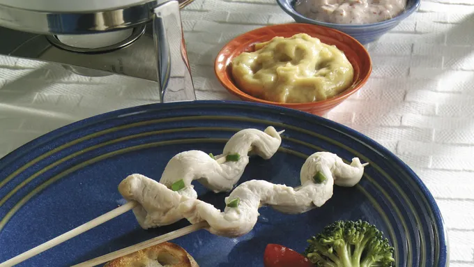 Step4With long-handled fondue forks, spear meats and vegetables; place in hot broth. Cook 2 to 4 minutes, keeping broth at a low boil, until beef and vegetables are desired doneness and chicken is no longer pink in center. (Because fondue forks become very hot, transfer meat and vegetables to plate and use table fork for eating.) Serve with sauces for dipping.