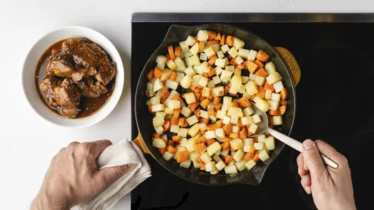 In 11- or 12-inch ovenproof skillet, heat oil over medium heat. Cook carrots and potatoes in oil 5 to 6 minutes or until vegetables are browned and softened slightly.