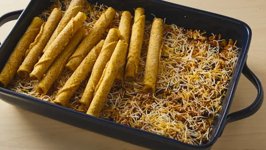 Step3Top mixture with taquitos. Bake for 35 minutes, top with remaining ½ cup cheese and bake for an additional 5 to 10 minutes until cheese is melted and taquitos are heated through. Serve with remaining ingredients.